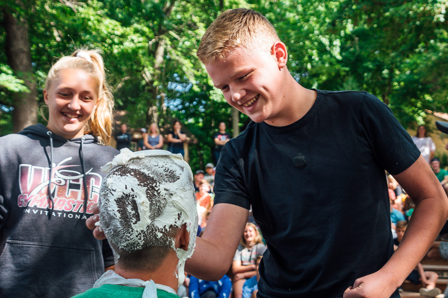 Then the moment every camper was waiting for (and every staff member was dreading)…pies!  Campers say memory verses throughout the week for a chance to pick a staff member to pie in the face.  Two campers and one staff are chosen out of a bucket of names each week and get to pick their victim.  After hearing proper pie-ing technique from Rich Olson, the Director of Youth and Family, pies fly!